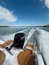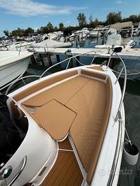 Musone a ribalta, cuscineria completa, tavolino, prolunga prendisole di prua, consolle ribaltabile, luci di navigazione, pompa di sentina, presa usb, serbatoio acqua con doccia, serbatoio benzina da 90 lt, scaletta bagno, volante con timoneria meccanica, 4 bitte, serie completa corrimano inox.