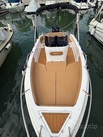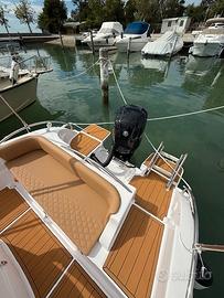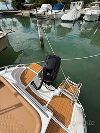 Musone a ribalta, cuscineria completa, tavolino, prolunga prendisole di prua, consolle ribaltabile, luci di navigazione, pompa di sentina, presa usb, serbatoio acqua con doccia, serbatoio benzina da 90 lt, scaletta bagno, volante con timoneria meccanica, 4 bitte, serie completa corrimano inox.