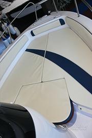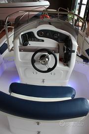 Luci di via, asta 360°, 6 bitte, cuscini a cellula chiusa, impianto idraulico con doccia , impianto carburante completo di serbatoio 60 litri e indicatore liv carburante, consolle abbattibile, scaletta risalita inox, volante con timoneria mono cavo , tavolino, panca poppiera, poggiapiedi, pompa di sentina, pozzetto auto svuotante statico, musone inox con carrucola e proteggi prua inox, tromba elettrica, Presa 12 v e usb, impianto elettrico con 1 batteria, fascia colorata blu,