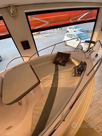 Musone a ribalta, cuscineria completa, tavolino, prolunga prendisole di prua, consolle ribaltabile, luci di navigazione, pompa di sentina, presa usb, serbatoio acqua con doccia, serbatoio benzina da 90 lt, scaletta bagno, volante con timoneria meccanica, 4 bitte, serie completa corrimano inox.