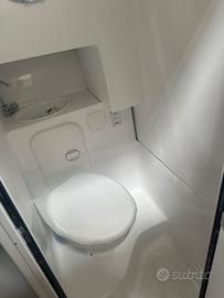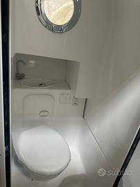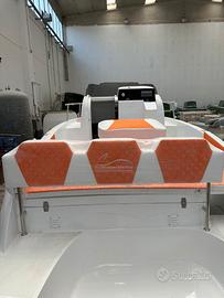 Ampia cabina interna con 2 posti letto e locale bagno separato; ampio prendisole di prua; ottimo confort di navigazione e stabilità; chiglia ad alta efficienza con perfetto equilibrio dell'angolo di chiglia per una riduzione dei consumi e della potenza richiesta; bagno separato con wc elettrico, lavello e doccia, impianto doccia con serbatoio 100 litri, doccia esterna, Cuscineria completa, Pannello elettrico, stacca batteria, tromba, Pompa di sentina automatica, Serbatoio carburante, Timoneria idraulica, Delfiniera di prua in VTR, Scala bagno inox telescopica, Lavello, Tavolino in cabina, Prolunga prendisole di poppa utilizzabile come tavolo, Plancette di poppa, serbatoio benzina 160 litri con indicatore, luci interne, luci led esterne, lavello su seduta con fuoco e frigo, luci di via e fonda, salpa ancora elettrico, Antivegetativa, Verricello elettrico con catena e ancora, copriconsolle.