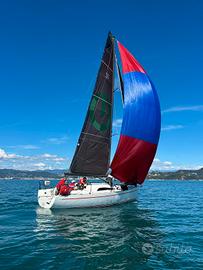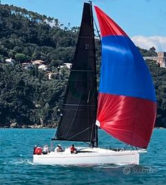 Randa e fiocco da crociera in dacron grigio quasi nuove. Randa square top e fiocco steccato in dacron rinforzato quasi nuovi, fiocco steccato in laminato nuovo, code 0 con frullino quasi nuovo, tormentina e gennaker nuovo. Bompresso in vetroresina con alloggiamento per ancora.