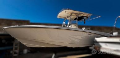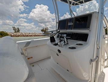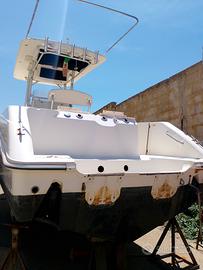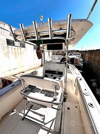 Center consolle americano che non ha bisogno di presentazioni, dotato di tutto cio che la categoria richiede, locale bagno con wc elettrico sotto la consolle, flaps elettroidraulici strumetazione raymarine e 80 con doppio strumento, trasduttore da 1 kw, radar, faro direzionale elettrico, vhf, pompa acqua dolce, pompa acqua salata, salpa ancora elettrico, t-top rigido in vetroresina con prolunga tendalino estensibile poppa, vasca del vivo,porta canne da riposo e da lavoro, vasche del pescato, cuscineria completa. natante introvabile solo scafo senza motore o motori ma se volete abbiamo una vasta scelta tra nuovo o usato. qualsiasi visione e o ispezione del vostro tecnico o meccanico di fiducia.