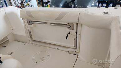 soft top con 5 porta canne originali Taco Sport Fishing, ulteriori 6 porta canne (di cui 4 incassati in murata e 2 nello stand up) e ulteriori 3 porta canne incassati a poppa, 4 poggia canne a scomparsa a prua e sotto prendisole, stand up poggiareni con contenitore (gavone),