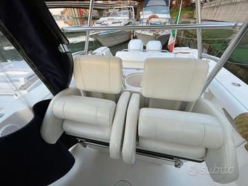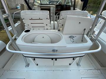 Accessori: Strumento Furuno 12' con GPS e ecoscandaglio, radar, VHF, radio musicale, salpa ancora elettrico, faro elettrico, vasche del vivo e vasche del pescato, frigo, bagno in cabina separata, doccia, scaletta a scomparsa, oltre 10 portacanna, tappezzeria in ottimo stato