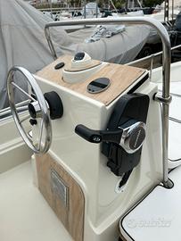 L’imbarcazione è dotata di plancia di guida centrale con seduta e vano contenitore, manetta laterlae con alza/abbassa motore elettrico, pompa di sentina, cuscineria completa.