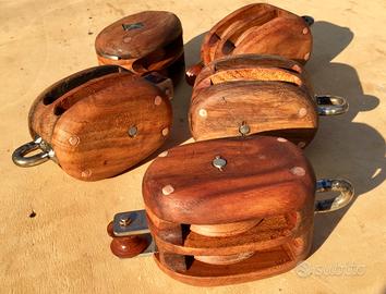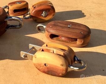 Bozzelli in legno per barche classiche, in varie misure e tipologie. Fatti con legni pregiati mandorlo, giuggiolo e rovere. Ferramenta in acciaio inox e rame con puleggia in rexilon.