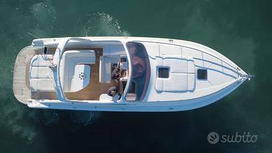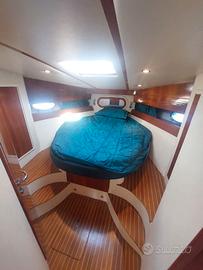 Bandiera: Italiana Anno: 2003 Lunghezza: 12.49 metri Larghezza: 3.99 metri Portata persone: 12 Cabine: 2 Posti letto: 4 Bagni: 2 Motorizzazione: AB Volvo Penta TAMD75P 2 x 480HP Trasmissione: Linea d'asse Carburante: 1200 litri Acqua: 400 litri Velocità di crociera: 27 nodi Velocità massima: 35 nodi Imbarcazione privata, appena rimessata da cantiere specializzato (Nautica Sport), pronta alla navigazione. Livrea bianca e turchese, linee sportive e proporzioni armoniose. Ampi spazi esterni: prendisole a prua, zona living a poppa con tavolo centrale, cuscineria completa e pavimentazione in teak. Plancia ben organizzata, strumentazione Raymarine, copertura in acciaio con parabrezza integrato. Interni luminosi e ben rifiniti: cabina armatoriale a prua con letto matrimoniale e bagno dedicato con box doccia; cabina ospiti doppia a poppa sinistra; secondo bagno completo a poppa dritta, accessibile dalla dinette. Zona giorno con cucina attrezzata (piano cottura, lavello inox, frigorifero, microonde) e divano a L con tavolo regolabile. Pavimentazione in teak, impianti ordinati, atmosfera calda e funzionale. ALLESTIMENTO TECNICO E DI COPERTA Allarme motore, Ancora, Autoclave, Batterie, Caricabatterie, Doccia esterna, Elica di prua, Flap elettrici, Impianto antincendio, Luci di cortesia, Passerella, piattaforma: Piattaforma, Pompa di sentina automatica, Pompa di sentina elettrica, Porta di ingresso, Pozzetto in teak, Presa 220V banchina, Presa acqua banchina, Rollbar, Salpa ancora elettrico, Scaletta da bagno, Tavolo in pozzetto, Tromba CUCINA ED ELETTRODOMESTICI Cucina, Fornello, Frigorifero esterno, Frigorifero interno, Microonde DOTAZIONI DOMESTICHE DI BORDO Aria condizionata, Boiler, Inverter, Prese interne 12V, Prese interne 220V, Wc marino elettrico INTRATTENIMENTO Radio AM/FM, Stereo STRUMENTAZIONE ELETTRONICA E DI NAVIGAZIONE Angolo barra, Bussola, Ecoscandaglio, Pilota automatico, Plotter con antenna GPS, Radio VHF TAPPEZZERIE Cuscineria completa, Cuscineria di poppa