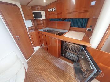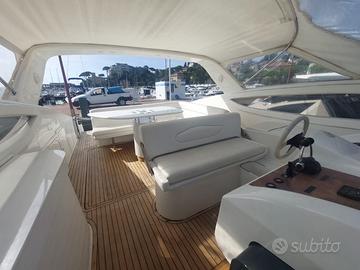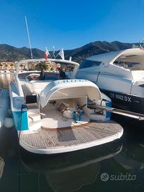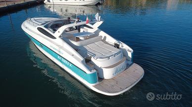 Bandiera: Italiana Anno: 2003 Lunghezza: 12.49 metri Larghezza: 3.99 metri Portata persone: 12 Cabine: 2 Posti letto: 4 Bagni: 2 Motorizzazione: AB Volvo Penta TAMD75P 2 x 480HP Trasmissione: Linea d'asse Carburante: 1200 litri Acqua: 400 litri Velocità di crociera: 27 nodi Velocità massima: 35 nodi Imbarcazione privata, appena rimessata da cantiere specializzato (Nautica Sport), pronta alla navigazione. Livrea bianca e turchese, linee sportive e proporzioni armoniose. Ampi spazi esterni: prendisole a prua, zona living a poppa con tavolo centrale, cuscineria completa e pavimentazione in teak. Plancia ben organizzata, strumentazione Raymarine, copertura in acciaio con parabrezza integrato. Interni luminosi e ben rifiniti: cabina armatoriale a prua con letto matrimoniale e bagno dedicato con box doccia; cabina ospiti doppia a poppa sinistra; secondo bagno completo a poppa dritta, accessibile dalla dinette. Zona giorno con cucina attrezzata (piano cottura, lavello inox, frigorifero, microonde) e divano a L con tavolo regolabile. Pavimentazione in teak, impianti ordinati, atmosfera calda e funzionale. ALLESTIMENTO TECNICO E DI COPERTA Allarme motore, Ancora, Autoclave, Batterie, Caricabatterie, Doccia esterna, Elica di prua, Flap elettrici, Impianto antincendio, Luci di cortesia, Passerella, piattaforma: Piattaforma, Pompa di sentina automatica, Pompa di sentina elettrica, Porta di ingresso, Pozzetto in teak, Presa 220V banchina, Presa acqua banchina, Rollbar, Salpa ancora elettrico, Scaletta da bagno, Tavolo in pozzetto, Tromba CUCINA ED ELETTRODOMESTICI Cucina, Fornello, Frigorifero esterno, Frigorifero interno, Microonde DOTAZIONI DOMESTICHE DI BORDO Aria condizionata, Boiler, Inverter, Prese interne 12V, Prese interne 220V, Wc marino elettrico INTRATTENIMENTO Radio AM/FM, Stereo STRUMENTAZIONE ELETTRONICA E DI NAVIGAZIONE Angolo barra, Bussola, Ecoscandaglio, Pilota automatico, Plotter con antenna GPS, Radio VHF