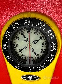 Bussola con carcassa morbida Marca "Riviera" resistente agli urti. si porta al collo. ideale per surf, piccole barche, come bussola di emergenza e come bussola da rilevamento essendo provvista di tacche di mira e doppia lettura frontale superiore. rosa di 5° in 5°, sospensione a spillo, galleggiante. Dimensioni: mm.27h x 103 l - diametro 7 cm. gradazione rosa di 10°