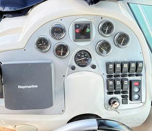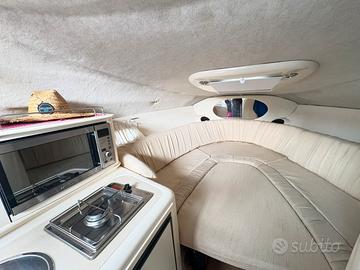 Ampio prendisole di prua con cuscineria completa, moquette nautica, angolo cottura interno con lavello, microonde, frigo e fornello gas, lavabo esterno, WC elettrico marino con lavabo. Doccia interna ed esterna, entrambe con acqua calda/fredda. Verricello elettrico, ecoscandaglio, GPS.