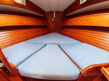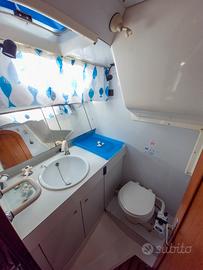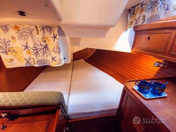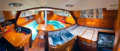 Disposizione interna: cabina di prua a V, cabina armatoriale a poppa, dinette con possibilità di ricavare 2/3 cuccette, tavolo da carteggio, cucina a L con lavabo doppio, ampio frigorifero a pozzetto, piano lavoro piastrellato, cucina basculante tre fuochi e forno, bagno con doccia e WC nautico manuale. 2 serbatoi acqua dolce (300 l) e pompa per acqua di mare.