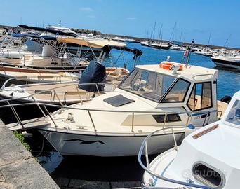 Cabinato Vegliatura 700, lunghezza 7,20 m, larghezza f.t. 2.6 m con pozzetto ampio e comodo per la famiglia e la pesca, ideale per bolentino di profondità e traina. Pozzetto dotato di panche laterali in legno a scomparsa e 2 ampi gavoni,