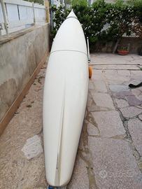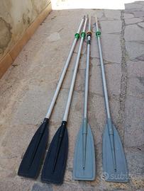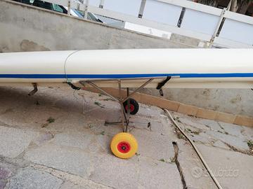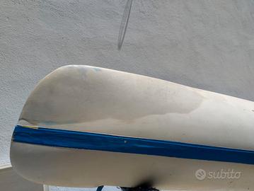 Canoino biposto in vetroresina di colore bianco avorio. Modello Relax 2. Anno 1997. Dimensioni: lunghezza 5 m, larghezza 66 cm, larghezza agli scalmi 160 cm. Peso: 42 Kg. Carrello di seduta scorrevole e punta piedi regolabile. 3 gavoni. 4 remi non originali. Carrello di trasporto con due ruotini in gomma autocostruito. Riparazione in vetroresina. Il canoino è stato successivamente provato e risulta perfettamente funzionante.