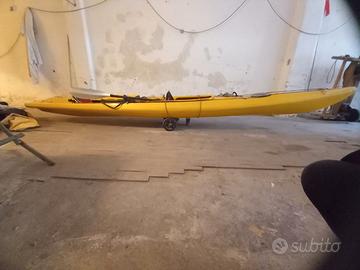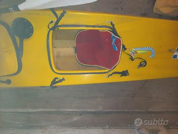 canoa di 4,30 metri in vetroresina con due gavoni stagni, pompa di sentina, bussola, piccolo carrello in legno per spostamenti, pagaia, pronta all'uso vendo