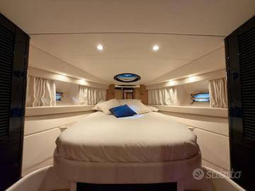 Gli interni, luminosi e ariosi, offrono una cabina armatoriale a prua con bagno indipendente, un salone con cucina e una cabina ospiti particolarmente ampia e confortevole, data la sua collocazione a centro barca.