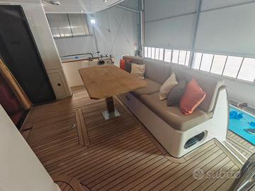 Altoparlanti, Antenna Satellitare TV, Aria condizionata, Bimini (prendisole di prua), Boiler, Clima reversibile, Copripozzetto, Cuscineria completa, Digitale Terrestre, Dissalatore (agosto 2023), Dotazioni di sicurezza entro 50 miglia, Fornello, Forno, Frigorifero esterno, Frigorifero interno, Impianto TV, Inverter (agosto 2023), Pavimento interno in legno (anche cabine), Piastra in vetroceramica, Prese interne 12v, Prese interne 220v, Radio AM/FM, Riscaldamento, Stereo, Telecamera (pozzetto), Tendalino, TV, 2 WC marino elettrico