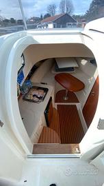 Caratteristiche Principali •Lunghezza f.t.: 8,1 m •Larghezza: 2,60 m •Peso scafo: 1.900 kg •Capacità Serbatoio Carburante: 350 Lt •Capacità Serbatoio Acqua: 80 Lt •Portata Persone: 8 •Categoria CE: C •Posti Letto: 2 Dotazioni e Allestimento: •Interni: Cabina prua, locale WC separato, cucina con fornello, lavello e frigo. •Esterni: Cuscineria completa, prendisole prua, doccia esterna, plancette poppa, salpa ancora elettrico. •Motorizzazione: 2 x Jonhosn 150hp •Alimentazione: Benzina •Velocità (croc) 23kn •Velocità (max) 32kn COMMISIONI AGENZIA ESCLUSE