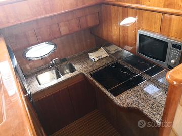 DESCRIZIONE INTERNI: Cabina armatoriale a prua con bagno e box doccia; 2 Cabine ospiti con letti in piano; Bagno ospiti con box doccia; Cucina attrezzata e sottoposta con piano cottura, frigorifero Frigo/Freezer e lavabo a doppia postazione; Dinette con tavolo rimovibile sulla destra; Cockpit ad U lato sinistro. Essenze in ciliegio lucido.