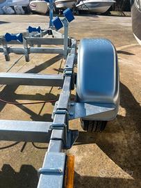 Dispositivo di aggancio con giunto a sfera con pulsantino di sicurezza. Impianto elettrico completo di fanale retromarcia e spina 13 poli. Ruotino pivottante diametro 48 mm. Cavetto di sicurezza. Parafanghi Dehan in lamiera stondata