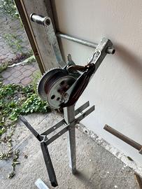 Non è munito di ruote posteriori, il costo delle ruote è di circa 60€ l'una, munito di ruota anteriore grigia (comprata separatamente) e ruote con cui viene venduto, completo di argano con corda per tirare la moto.