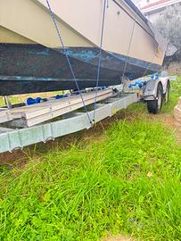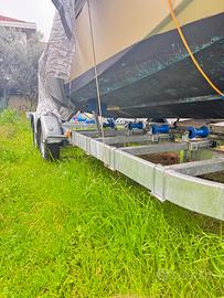 Carrello basculante in acciaio zincato a caldo; Longheroni portanti in Domex di spessore pari a 40/10 e di altezza pari a 140 mm. muniti di rinforzo interno forato; Timone in Domex di sezione quadrata 120x120 mm.; N°7 traverse del telaio di sezione pari a 60x60 mm., la cui posizione in lunghezza può variare, essendo imbullonate ai longheroni laterali portanti mediante opportune staffe. Tali traverse possono essere installate alla stessa altezza del profilo inferiore dei longheroni o del profilo superiore dei longheroni (in tal modo si crea un piano unico di appoggio) o ribassate centralmente; Numero totale delle traverse posizionate in senso trasversale: 10; Staffe di fissaggio delle traverse munite di asole, al fine di favorire l’ancoraggio delle cinghie mediante le quali viene legata la barca o il gommone; N°assi: 2; Parafanghi in alluminio antiscivolo di spessore pari a 20/10 (2 mm.); Rulleria completa di colore azzurro; N°10 rulli centrali la cui posizione può essere regolata in larghezza ed altezza; N°8 rulli laterali la cui posizione può essere regolata in larghezza ed altezza; Argano manuale con cavo in acciaio kg. 1650 a doppia velocità; Piantone porta argano munito di piastre di fissaggio imballante al timone; Fermo prua con supporti in gomma, munito di piantone; Traversa fanali estraibile, munita di piastre di fissaggio, ovvero è possibile estrarre solo il fascio delle luci, mantenendo i sostegni inseriti all’interno dei longheroni laterali. La traversa dei fanali funge da barra posteriore paraincastro