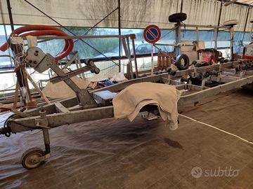 Carrello 18 ql a pieno carico, telaio del 27 ql (doppio asse) monoasse immatricolato 1800 kg, per imbarcazioni fino a 8-8.50 MT, impianto per risciacquo ganasce, rulleria completa, ferma prua con argano, ruota di scorta, revisionato, pronto all'uso