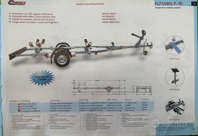 Carrello nuovo marca CRESCI modello N750S.F-R con portata complessiva di 750 kg completo di dotazione di serie. Barra multirullo basculante per facilitare la discesa. Prezzo di listino euro 2589. PREZZO SCONTATO compresa immatricolazione euro 2230. Per qualsiasi altra informazione Mostra numero anche whatsapp.