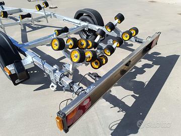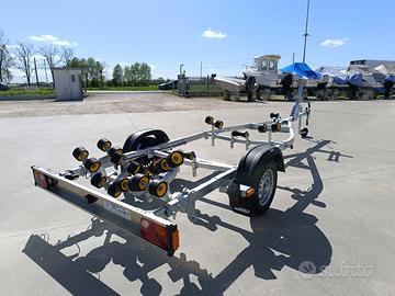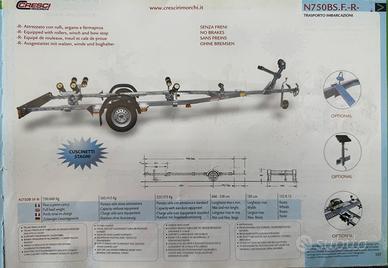 Carrello nuovo marca CRESCI modello N750S.F-R con portata complessiva di 750 kg completo di dotazione di serie. Barra multirullo basculante per facilitare la discesa e il recupero della barca. Prezzo di listino euro 2.695 iva e immatricolazione incluse. PREZZO SCONTATO compresa iva e immatricolazione euro 2.320. Per qualsiasi altra informazione anche whatsapp
