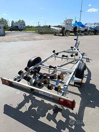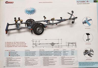 Carrello nuovo marca CRESCI modello N750BC-R con portata complessiva di 750 kg completo di dotazione di serie. Barra multirullo basculante per facilitare la discesa e il recupero della barca. Prezzo di listino euro 2.950 incluso iva e immatricolazione. PREZZO SCONTATO compresa iva e immatricolazione euro 2.520. Per qualsiasi altra informazione anche whatsapp.