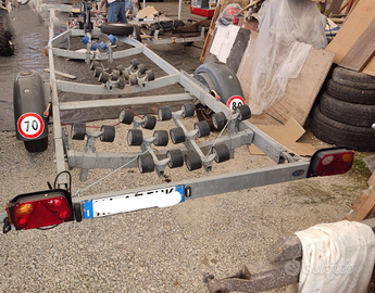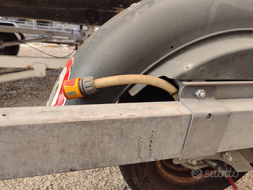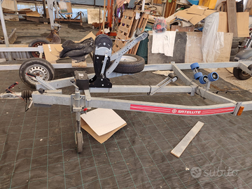 Rimorchio marca Satellite 1000 kg, usato pochissimo ottimo stato conservato al coperto, completo di rulleria come da foto, ruota di scorta, ferma prua con argano, impianto lavaggio freni, porta targa estensibile, targa nuova non necessita di targa auto ripetitrice, revisione eseguita, documenti in regola