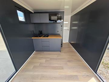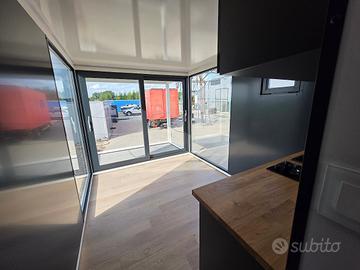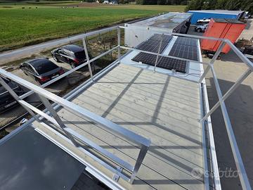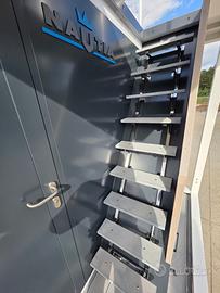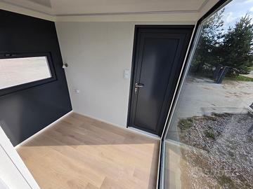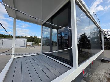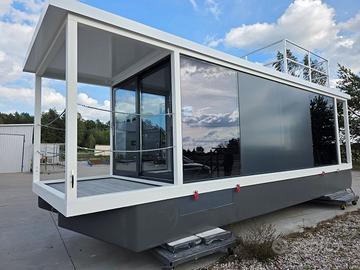 Casa N 4: 8.5m x 2.55m lunghezza parte residenziale 6.1m, ponte in prua 1.5m, ponte in poppa 0.9m massa 3 tonnellate, serbatoio acqua 150 l, serbatoio trattamento biologico acque nere 800 l. Altezza 3.1m, altezza da linea di galleggiamento 2.8m, pescaggio 0.3m DOTAZIONI COMPRESE NEL PREZZO: telaio in alluminio, scaffi inaffondabili in elastomero styrodur (XPS). Indicatori livelli utenze, collegamenti a terra acqua e acque nere, una camera da letto, pareti interne bianche o antracite, draglie e candelieri sui terrazzi, finestre doppie in alluminio, pavimento panelli in legno, impianto acqua, pavimento sui terrazzi legno naturale, impianto elettrico, prese CCE collegamenti SAT, illuminazione interna e esterna LED, luci di via, segnalatore acustico, cabina bagno: doccia, WC marino elettrico con maceratore, lavandino, terrazza sul tetto , Equipaggiamento cucina: mobili bianchi o neri, frigo, forno microonde, fornello a gas o elettrico, lavandino , boiler elettrico, riscaldamento simil Webasto diesel , aria condizionata in salotto, sistema solare panelli PV: 400W x 4 , 1600W, batteria 2 x 200 Ah, controllo carica computerizzato, inverter 230 V 5000 W. In opzione motore fuori bordo.