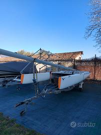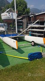 Catamarano classe A armato singolo, albero 9 mt non divisibile, randa steccata senza boma, stick telescopico in carbonio, trampolino rifatto due anni fa, timoni nuovi, derive, paranco randa 8:1, ascensori trapezio con strozzatore. Carrello di alaggio e carrello stradale. Buone condizioni pronto per la navigazione. 1.500 ?. Visibile a Gravedona (CO)
