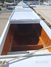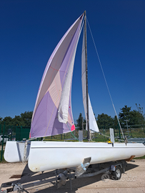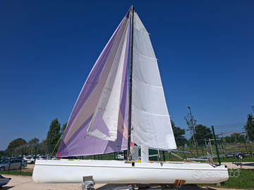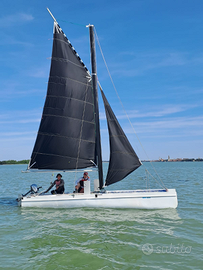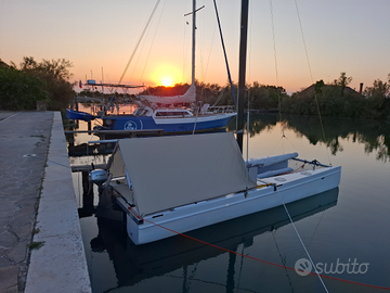 Catamarano in compensato marino, 6 x 2,2 metri solidissimo e stabile. Peso 220 kg. Albero in carbonio 7,10 m abbattibile da soli. Gavoni enormi. Può portare 4 - 5 persone. Due armi completi, randa fiocco gennaker ed un armo aurico con randa e due fiocchi neri. Ha una falla fa riparare di 8 cm sopra la linea di galleggiamento. Adatto per campeggio nautico, con una tenda costruita su misura da montare sul trampolino. Carrello da cantiere e telo copertura inclusi. Disponibili a parte motore fuoribordo 2,5 hp e carrello stradale adattato. Visibile a Mestre.