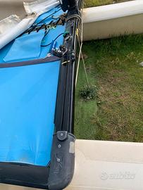 Hobie Cat 16, anno 2003, in perfetto ordine pronto a navigare e a regatare. Traversa anteriore con rotaie fiocco integrate, e rinforzata al centro. Paranco scotta randa Harken da 57, torrette fiocco e carrello randa con strozzatori Harken, strozzatori scotta carrelli fiocco sempre Harken. Vela originale in buone condizioni in quanto possiedo altri 2 giochi di vele che non vendo. Sartie, strallo e cavi trapezi cambiati 3 anni fa. Telo trampolino in ottime condizioni.