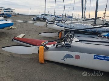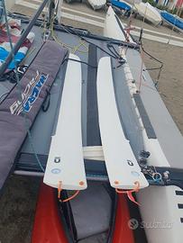 Vendo catamarano "nacra 17 ex olimpico" numero velico 87 in ottime condizioni, pronto per l'uso. Dispone di 2 rande efficienti, la parte alta con colori bandiera italiana e numero 87, una randa più usata e riparata; 3 fiocchi e 4 spinnacher . Anno di costruzione 2013 come da documenti originali di proprietà. Rimasto inattivo smontato fino inizio 2016 , poco usato visibile alla Lega Navale di Ostia con rimessaggio pagato fino aprile 2026 , carrello alaggio big foot con gondole compreso. rimessaggio scade a fine aprile Disponibilità di attrezzatura dedicata da indossare. Mariano