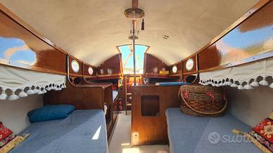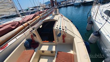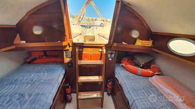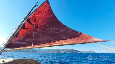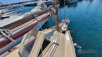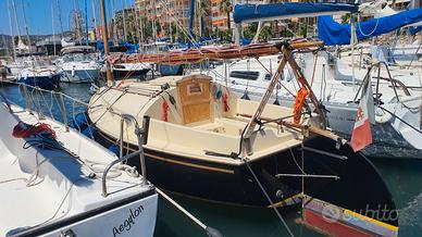 Stupendo cat boat cantiere Virdis di Morena (RM), esemplare praticamente unico, su progetto di Sergio Dejacobis, albero in legno reclinabile, deriva mobile, armo aurico, motore entrobordo bicilindrico a gasolio Ruggerini serie RM80 8CV.