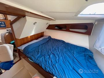 cabina matrimoniale armatoriale, letto matrimoniale su dinette giorno trasformabile, toilette ampia con WC nautico, frigo, piano cottura, boiler, 2 batterie, tappezzeria interna nuova, oscuranti per vetri sia neri che sabbia, salpancora radiocomandato, 3 pompe sentina più una manuale, doccetta acqua dolce pozzetto, pompa lavaggio ponte, molte altre dotazioni per la pesca (Rocket, supporto sonda panoptix, seconda ancora volante con 100mt cima galleggiante + 50 mt., ecc.