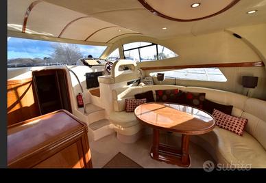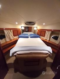 Lunga 12.80 con ben 2 cabine e 2 bagni. Cabina king size con bagno privato e doccia separata. Cabina twin size non bagno grande e confortevole. Frigorifero, congelatore, forno e fornelli ad induzione. Generatore . Motori 310cv d6. Passerella idraulica. Televisore . Radio. Prendisole sul fly, prendisole prua ed area relax a poppa.