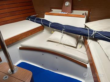 Resinatura e rinforzi coperta fatta a regola d'arte completa di antiscivolo in resina. 7 passaggi di gelcoat totali. Montaggio di 4 oblò maxi apribili a centro cabina che consentono una visione totale a 360 gradi sul mare. Spostato il timone di guida a poppa rendendo libero e vivibile il pozzetto dove c'è un tavolo per pranzare centrale, la timoneria è stata sostituita da una idraulica. Sopra il tavolo del pozzetto di poppa ha il suo tendalino.sotto coperta; cabina armatoriale con bagno e doppia porta di ingresso,cucina con lavello doppia vasca in acciaio e fornello doppio. Camera di poppa con bagno privato, porta e oblò per uscire all'esterno anche da poppa.