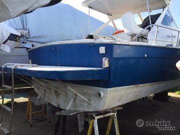 Chris Craft Supercatalina. Cabinato 8.5 m per 3.1 m vetroresina. cabina armatoriale di prua e bagno separato, dinette e divano che si trasforma in letto a castello per un totale di 6 posti letto. Frigorifero 50 litri, gas due fuochi, lavello inox, wc elettrico, verricello 1500w comandato da cruscotto o da prua, 50m catena calibrata, flap bennet, impianto 220 v con stazione ricarica batterie, 2 batterie 120w nuove, gps cartografico mediterraneo completo, due pompe sentina nuove, serbatoio nafta 400 l, acqua 150 l, autoclave con due docce, cuscineria completa interna ed sterna ecc. ecc. Prese a mare, timoneria idraulica, linee d'asse timoni tutto rinnovato. I motori sono due aifo 6 cil da 110 cv sbarcati perché anche se funzionanti scaldano (scambiatori da rivedere). C'è bisogno di una ristrutturazione delle parti in legno della coperta, alcune da sostituire alcune da ridipingere.