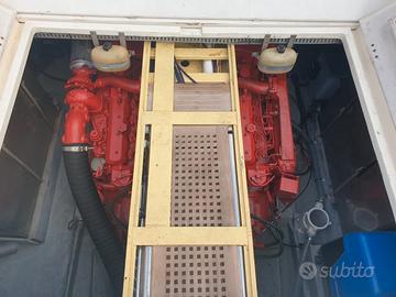 MOTORIZZAZIONE: 2 AIFO 8061 SRM 30.10 (300 CV X 2) sbarcati e riverniciati nel 2024.Sostituiti pistoni, riser fasce, iniettori e quanto necessario. Revisionate pompe, turbine, collettori scarico. Normale manutenzione di routine (olio motore, inverter, filtri etc). Sostituiti tutti i collettori e i tubi in gomma. Smontaggio e pulizia del serbatoio nafta da morchie e residui. Disinfezione serbatoi acqua. I lavori sono stati eseguiti e, documentati, da officina FPT ufficiale (Ing. G. DI PINTO Napoli). Velocità max 32 nodi. Crociera 23 nodi (consumo 25-30 lt/ora a motore). Sbarcati e riverniciati con check generale nel 2024