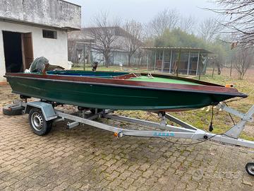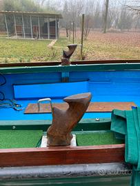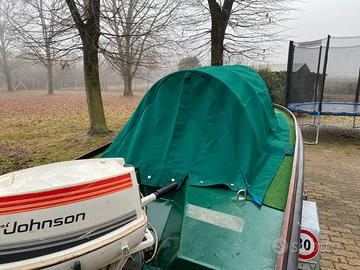 Vendo cofano in vetro resina con carrello Sacar revisionato il 04/12/2024 vermicello nuovo, barca completa di tiemo intero e tiemo corto impermeabile per dormire. Johnson 25cv 2t con avvio elettrico, doppia calandra bianca e mimetica, forcole e remi veneziani, impianto luci interno esterno.