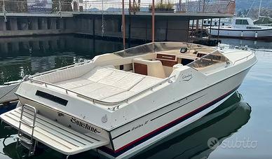 Imbarcazione sportiva con ampio prendisole a poppa. Cabina con divano a U trasformabile in doppia cuccetta. Anno 1981 Motori 2xMercruiser 260 efb da 240hp cad Batterie (2) - Bussola - Contaore - Cuscini pozzetto - Ecoscandaglio - Frigorifero interno - Impianto stereo - Pompa di sentina (2) - Tonneau - Tendalino parasole - Trombe - Verricello elettrico - Plancetta di poppa - Scaletta bagno Barca in secca