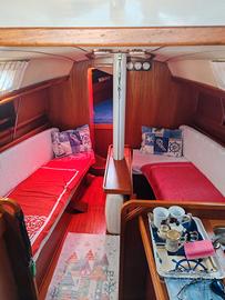 Gli interni sono suddivisi in cabina di prua per due, cabina di poppa per 2 e la dinette che ospita altri 2 per dormire. Tavolo da carteggio,bagno e cucina con 3 fuochi basculanti, forno, frigo -boat, frigo normale in banchina.