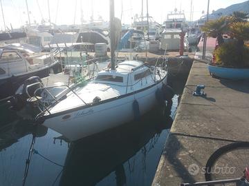 Barca a vela Natante Comet 801 : n.1 Genoa + n.1 fiocco + n. 1 Tormentina + n.1 randa steccata + n. 1 tangone e Spinnaker, sartiame 2007 tutte le manovre in pozzetto - motore Yanmar gm1 9cv Da rivedere. Ripartitore di carica, caricabatteria da banchina , n. 2 serbatoi, doccia di poppa, impianto elettrico e quadro in piena efficenza con illuminazione a led interna, pilota automatico (raytheon st 1000), GPS Cartografico (garmin) Autoradio radio vhf , frigo a pozzetto, cucina, bagno con WC jabsco, lavandino inox con autoclave. Tetto cabina foderata in sughero naturale : mantiene il fresco anche sotto il sole piu caldo, n.5 posti letto cabina di prua + 1 divano centrale e due cuccette poppa , tendalino, Carena da fare ! ma esente osmosi !garantito!. Ancora con 40 metri di catena - documentazioni della barca completa -- visibile al Porto di Lavagna (Ge).