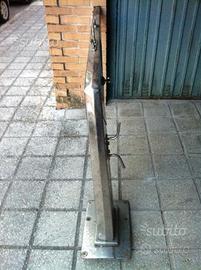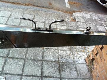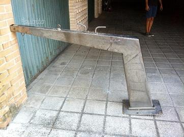 gruette in acciaio inox AISI 316 lucidato a specchio perfette condizioni robuste e funzionali lunghezza max 140 cm altezza max 120 cm base di fissaggio rettangolare cm 45 per 28 con 6 fori per fissaggio con bulloni da 10 mm bitte laterali e superiori doppia puleggia in testa