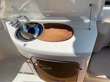 Tavolino per pranzo, scaletta discesa in acqua, pozzetto in tek, sedili guida e passeggero girevoli, cabina con 3 oblò, impianto stereo Cd Clarion con usb, wc elettrico Marino con scarico diretto in