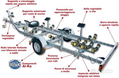 Rimorchi di moderna progettazione tutti zincati a caldo con trattamento antiossidazione per migliorarne la qualità. La maggior parte dotati di telaio e traversa posteriore basculanti per una migliore operazione di carico/scarico dell'imbarcazione.
