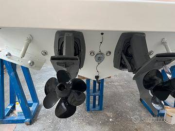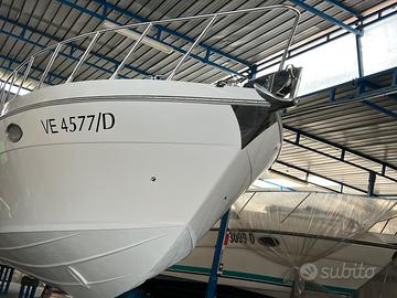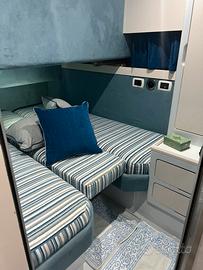 Disposizione interni ed esterni: 2 CABINE, 1 BAGNO: cabina armatoriale a prua, locale WC separato, dinette con tavolo, cabina di poppa con n* 3 posti letti in piano, cucina a dx con lavabo, fuochi e frigo; ampio pozzetto di poppa con divani e tavolo abbattibile elettricamente per creazione prendisole, plancia comando con seduta pilota e co pilota, ampio prendisole di prua.